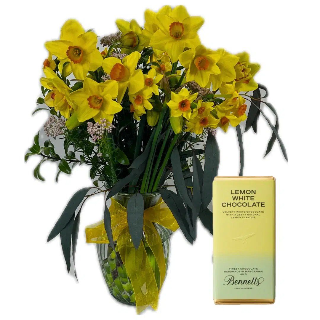 Daffodil Spring Flower Posy Includes Bennetts Chocolate Bar to enjoy with your stunning daffodils.