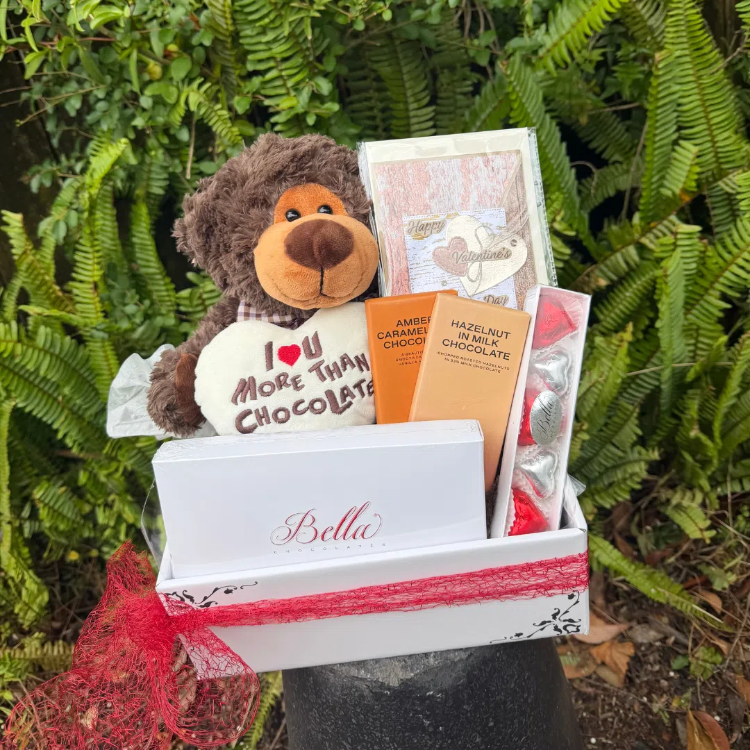 this giftset includes a brown bear thats say i love you more than chocolates. Perfect for some thats love there chocolates.